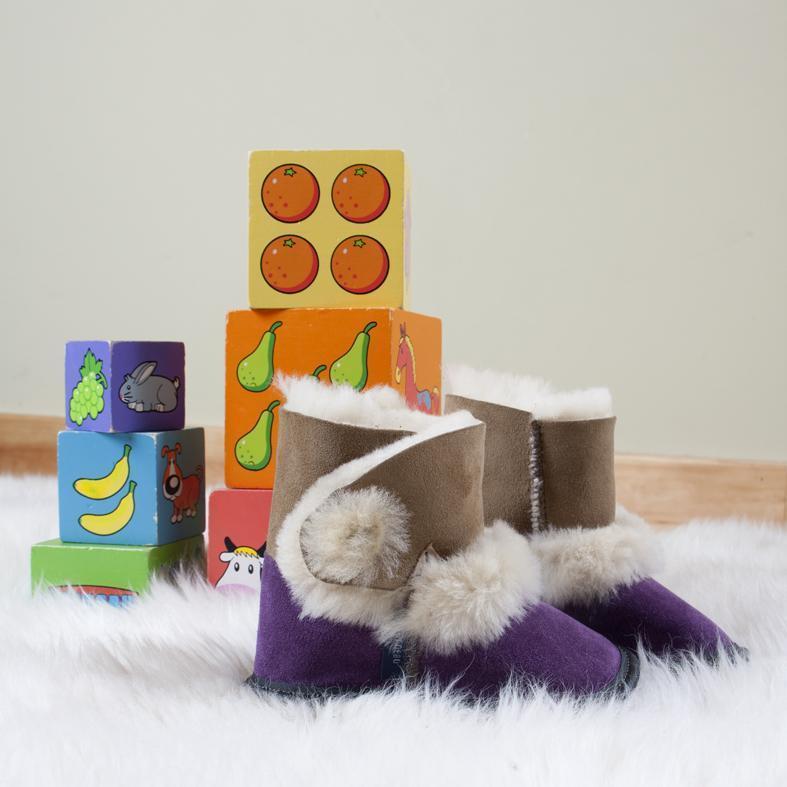 Your kids will never want to wear anything else again. Our kids’ sheepskin slippers made with reversed sheepskin and colorful suede are kids’ favorites. They are easy to step into and feature a side snap closure. Simply adorable!