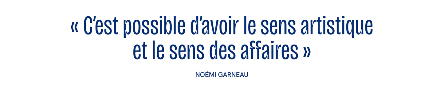 D’un côté son intérêt pour l’art et de l’autre, celui pour les chiffres, Noémi Garneau bifurque vers le domaine de la gestion. C’est après avoir fait son expérience en grande entreprise, qu’elle décide de tenir le rôle de « relève » de l’entreprise. Selon elle, « c’est possible d’avoir le sens artistique ET le sens des affaires ». Atelier Garneau lui offrira donc la possibilité de mettre son sens de la gestion au service des arts.